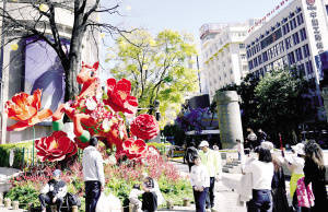 r南屏街忠爱坊北侧,运用高山杜鹃、云南山茶等50余种乡土花卉植物,打造主题为“观山·观水·观春城”的大型艺术沉浸式立体花雕;在北京路与白云路交叉口的同德昆明广场,一座名为“赤马迎春”的立体花雕巍然矗立……